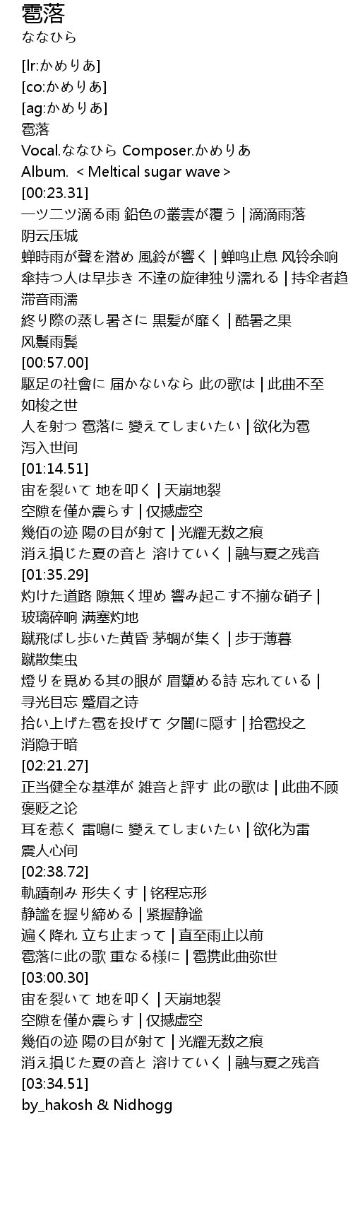 | [02:52.30] | 雹落に此の歌 重なる様に | 雹携此曲弥世 |