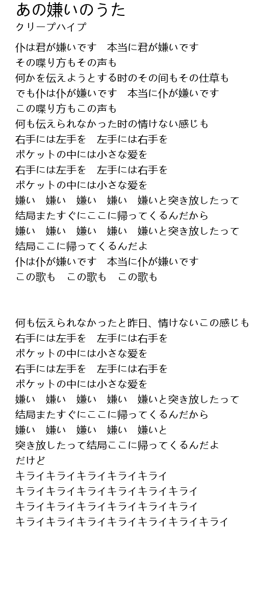 | 嫌い 嫌い 嫌い 嫌い 嫌いと突き放したって | |