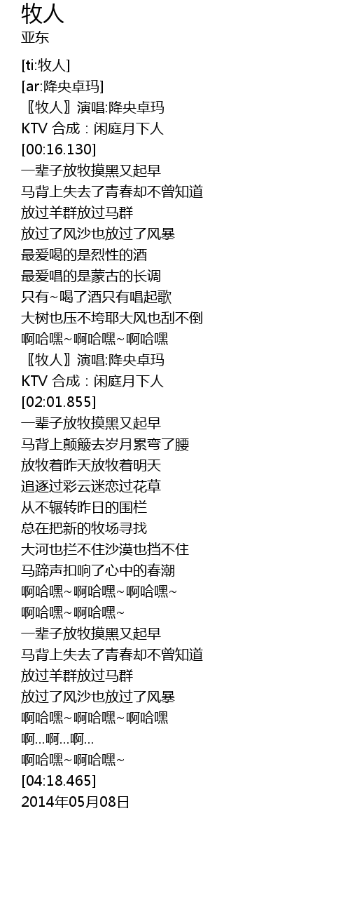 | [00:00.440] | 〖牧人〗演唱:降央卓玛 |