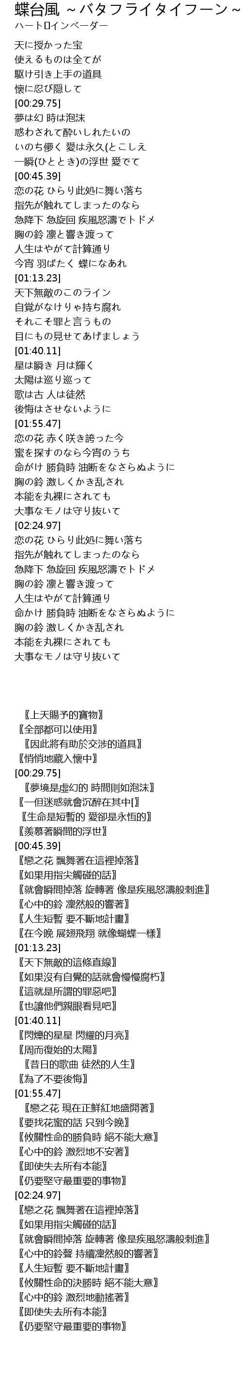 | [01:07.18] | 今宵 羽ばたく 蝶になあれ |