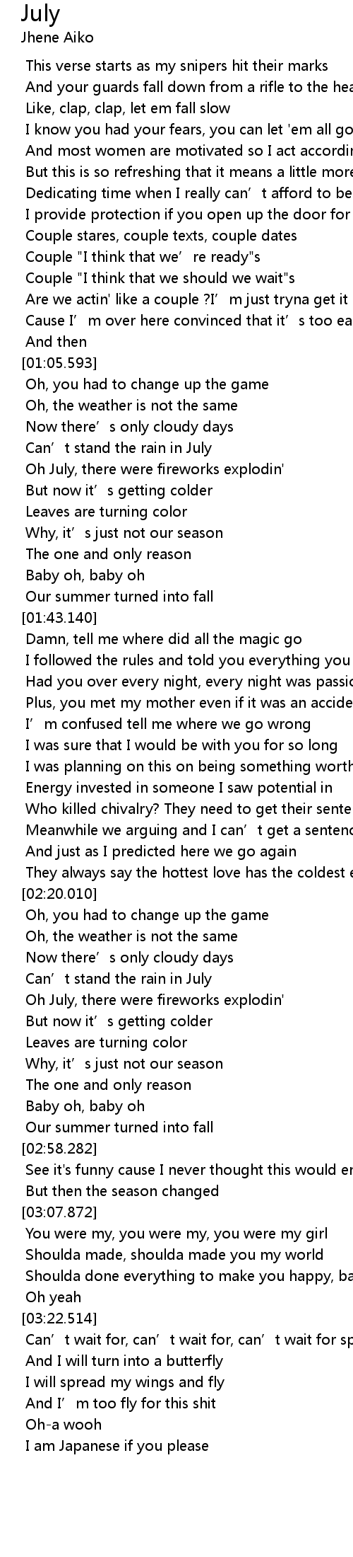 | [02:33.684] | Oh July, there were fireworks explodin' |