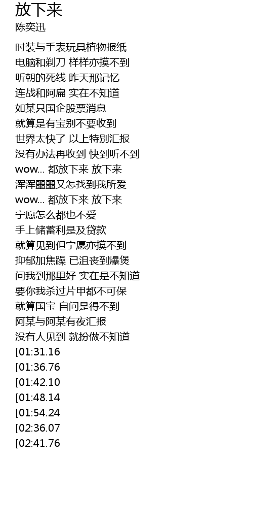 | [02:24.71][01:42.10] | wow... dōu fàng xià lái fàng xià lái |