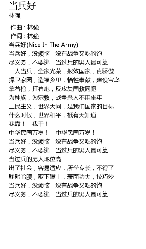 | [00:04.93] | 当兵好(Nice In The Army) |