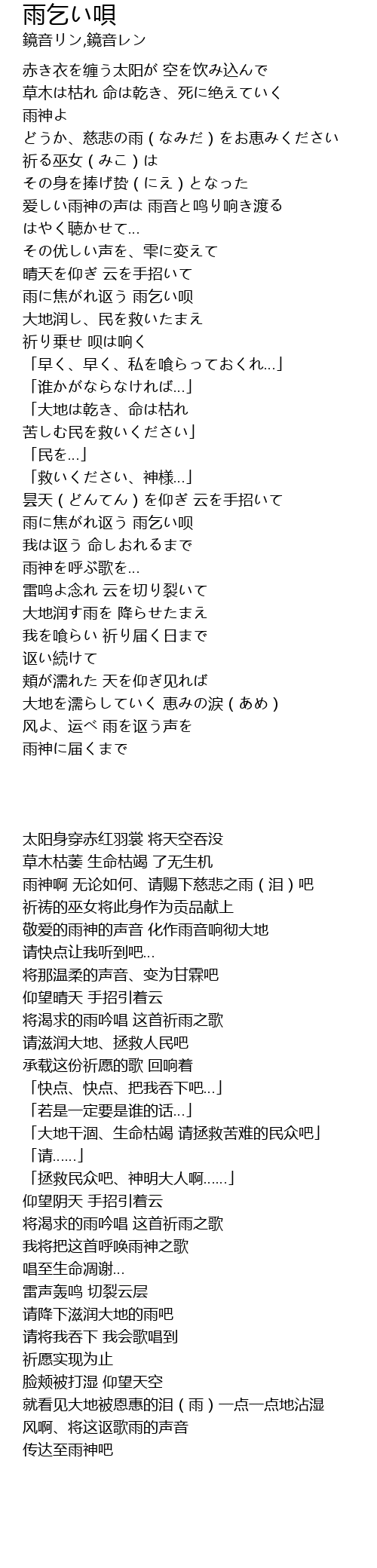 | [01:05.740] | 雨に焦がれ讴う 雨乞い呗 |