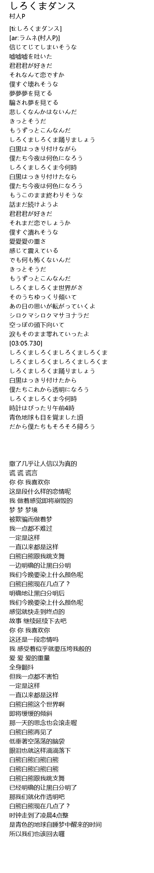 | [03:20.240] | しろくましろくま踊りましょう |