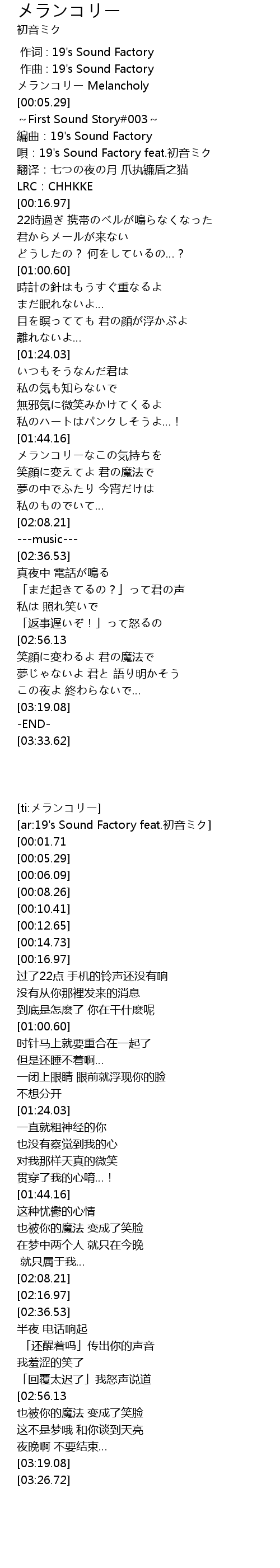 | [00:10.41] | 唄:19's Sound Factory feat.初音ミク |