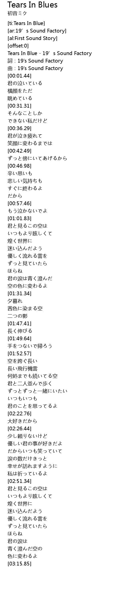 | [01:24.76] | 君の涙は青く澄んだ |