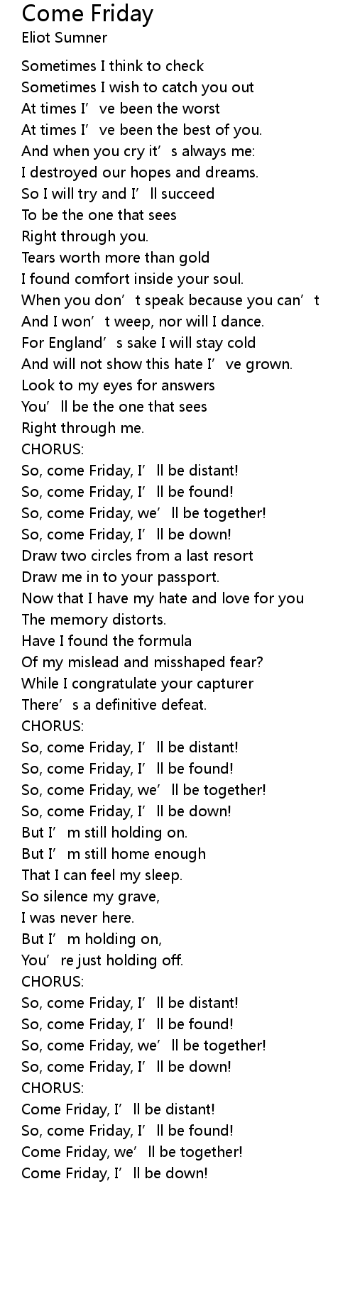 | Song | Come Friday |