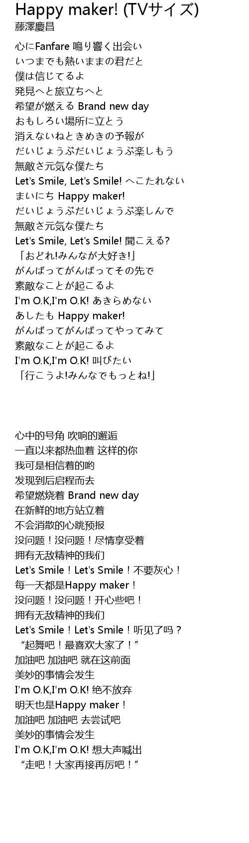| [01:15.95] | だいじょうぶだいじょうぶ楽しもう |