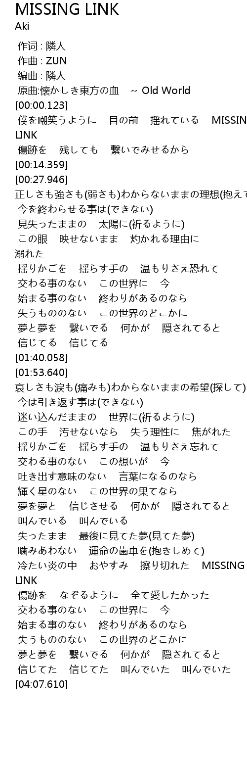 | [00:00.143] | 僕を嘲笑うように 目の前 揺れている MISSING LINK |