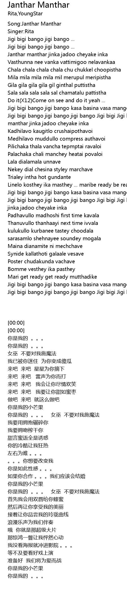 | [01:34] | Jigi bigi bango jigi bango jigi bango Jigi bigi Jigi bigi ... Janthar manthar jinka jadoo cheyake inka |