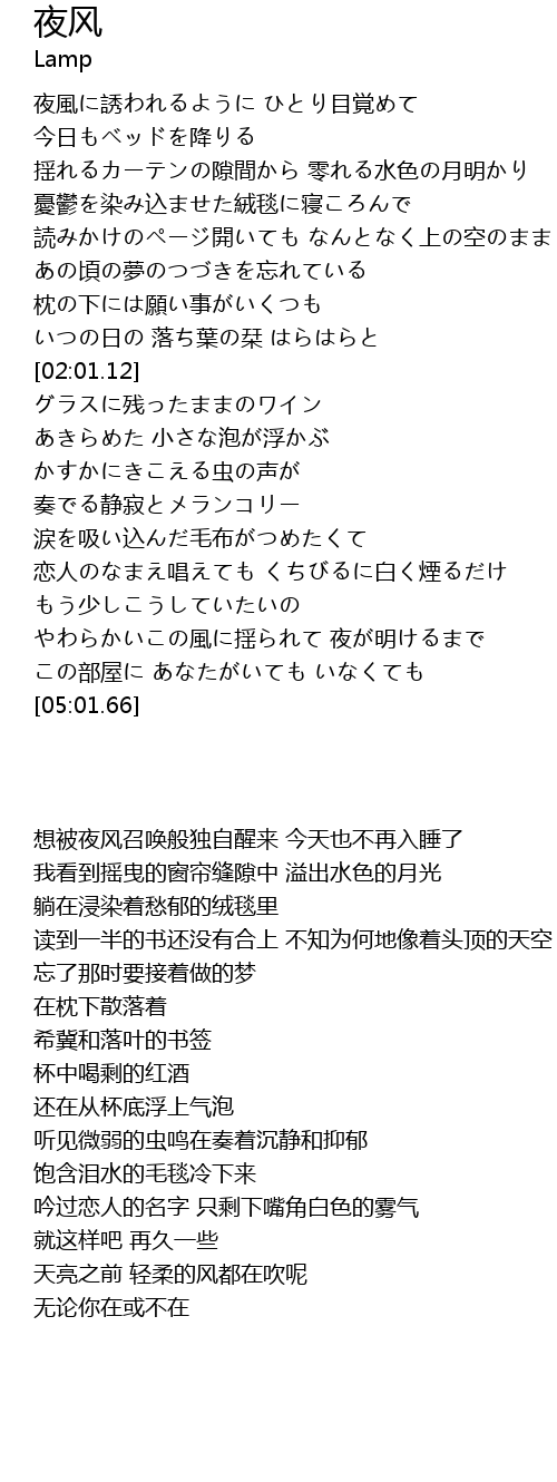 | [03:37.60] | やわらかいこの風に揺られて 夜が明けるまで |