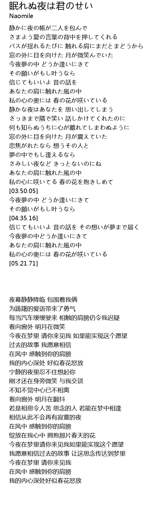 | [04:11.51] | 今夜夢の中 どうか逢いにきて その願いがもし叶うなら |
