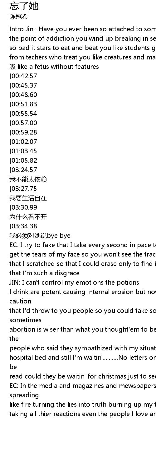 | [03:40.71][03:27.75][03:14.85][02:10.59][01:56.92][01:11.63] | 我要忘了她 我要生活自在 |