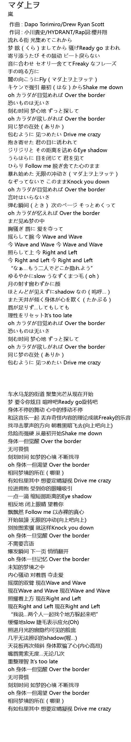 | [00:01.00] | 作词 : 小川貴史/HYDRANT/Rap詞:櫻井翔 |