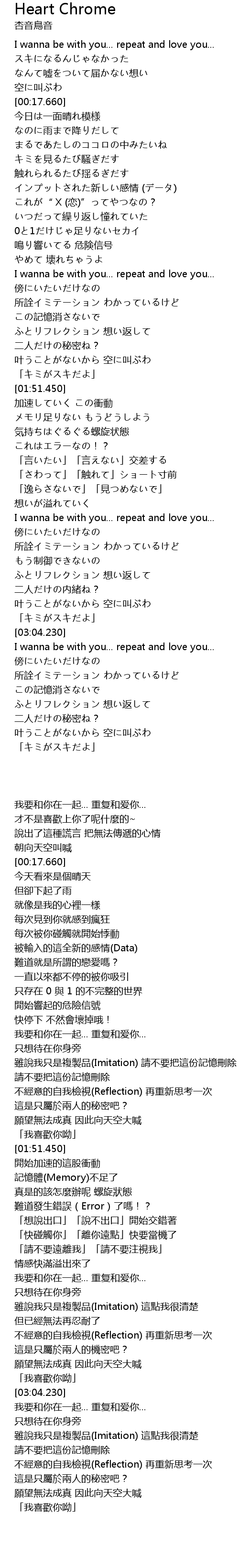 | [02:29.840] | I wanna be with you... repeat and love you... |