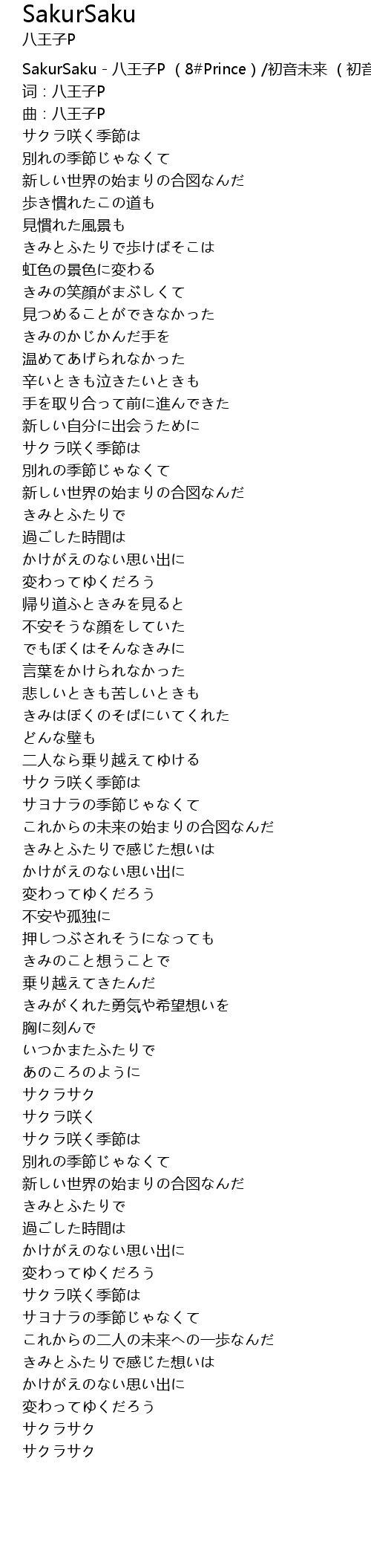| [00:00.10] | SakurSaku - 八王子P (8#Prince)/初音未来 (初音ミク) |