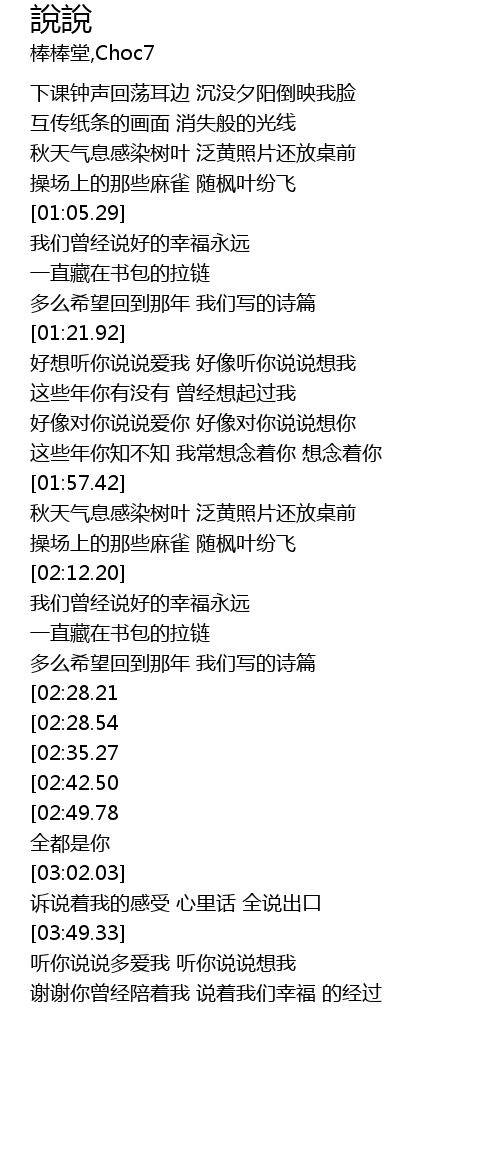 | [03:14.29][02:28.54] | 好想听你说说爱我 好想听你说说想我 |