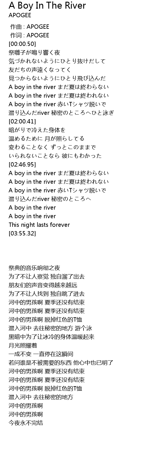 | [03:19.02] | A boy in the river 赤いTシャツ脱いで |