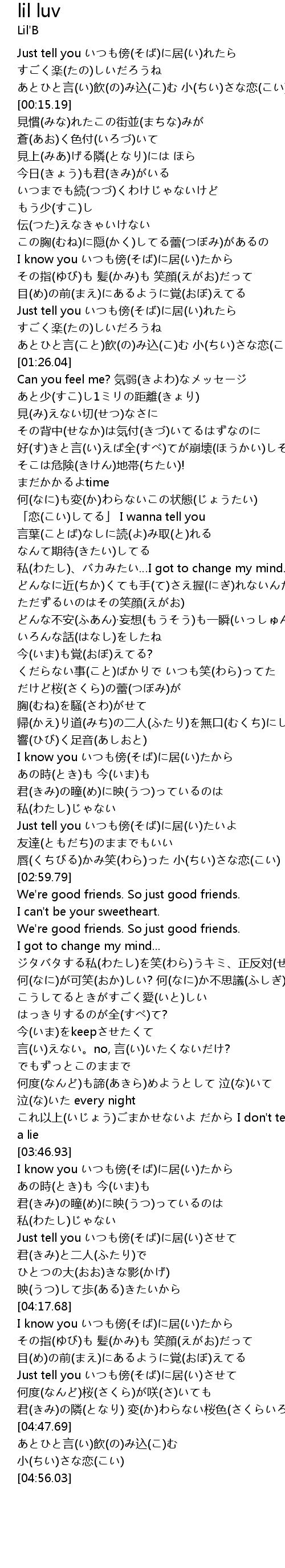 | [00:00.15] | Just tell you いつも傍(そば)に居(い)れたら |