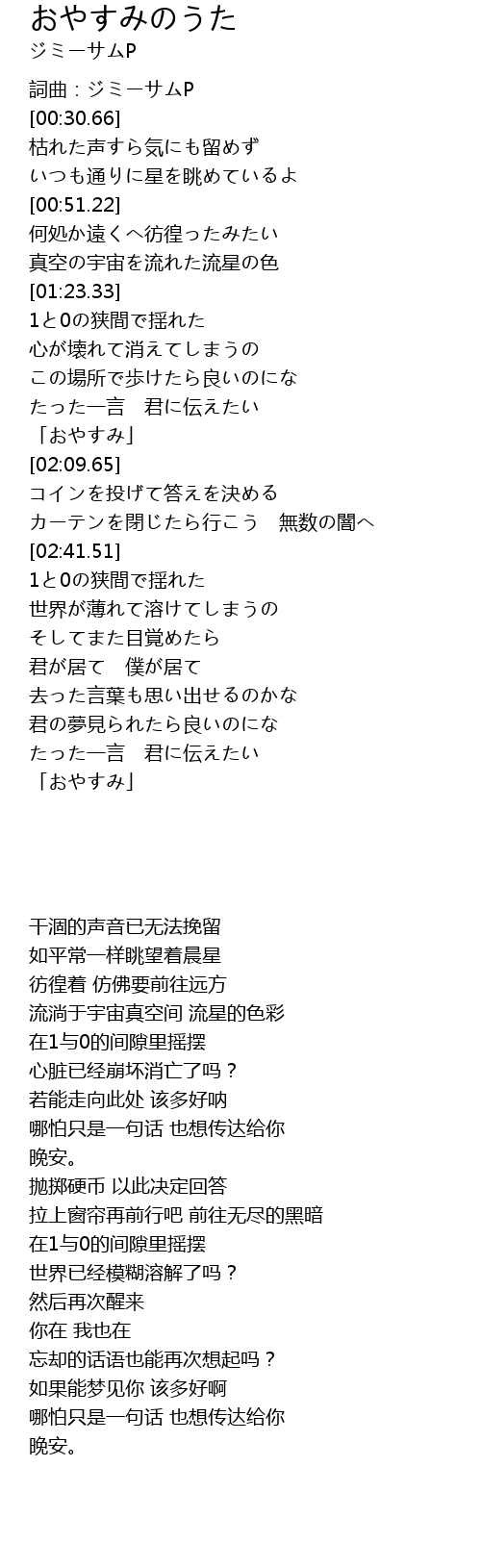 | [00:39.93] | いつも通りに星を眺めているよ |
