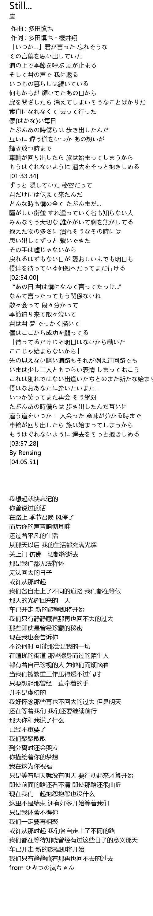 | [00:01.00] | 作词 : 多田慎也・櫻井翔 |