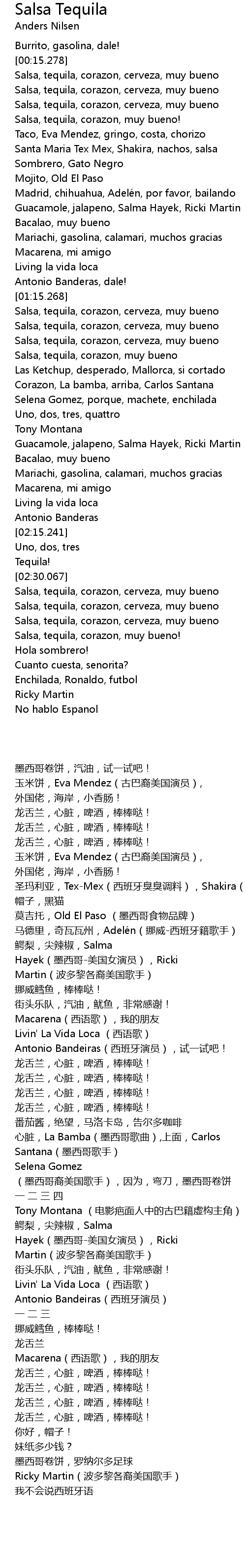 | [02:48.804] | Salsa, tequila, corazon, cerveza, muy bueno |
