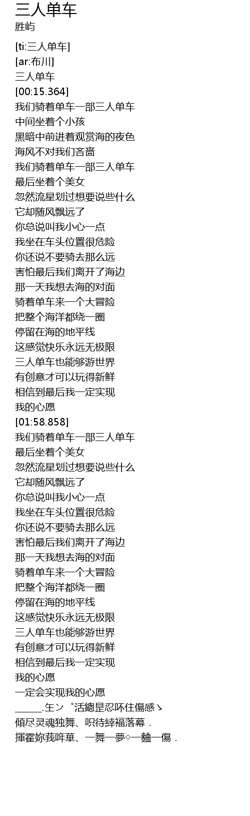 | [00:25.140] | 我们骑着单车一部三人单车 |