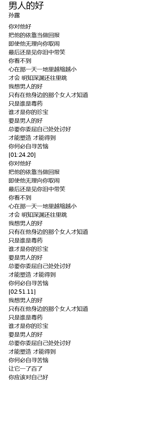 | [02:22.96] | wǒ xiǎng nán rén de hǎo |