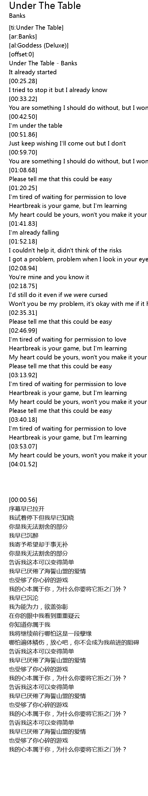 | [00:00.56] | Under The Table - Banks |