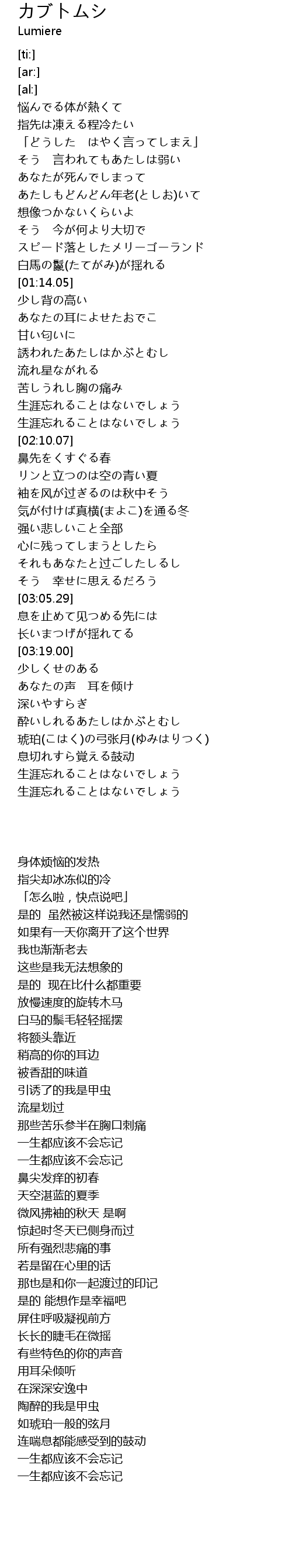 | [03:35.58] | 酔いしれるあたしはかぶとむし |