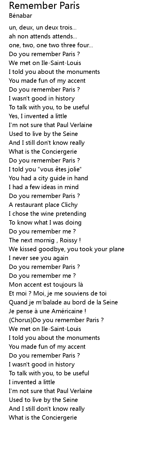 | [02:18.84] | Chorus Do you remember Paris ? |