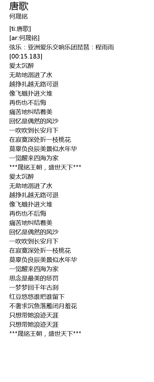 | [00:09.30] | 弦乐:亚洲爱乐交响乐团琵琶:程雨雨 |