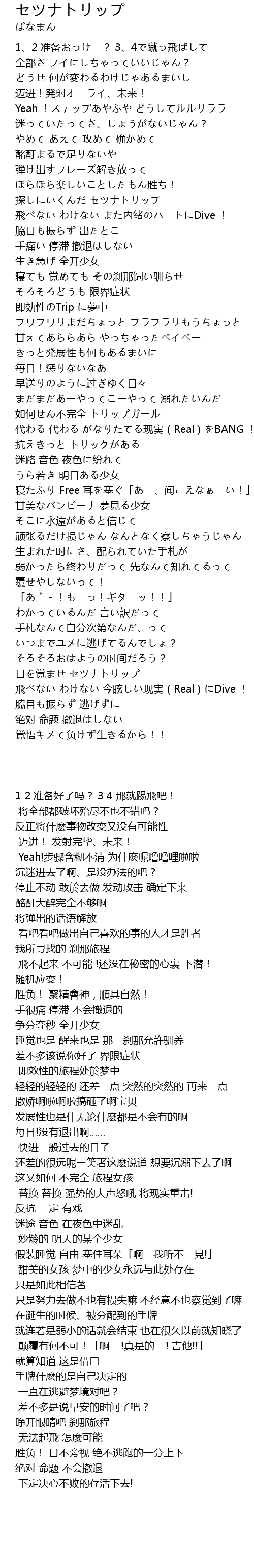 | [03:38.75] | 目を覚ませ セツナトリップ |