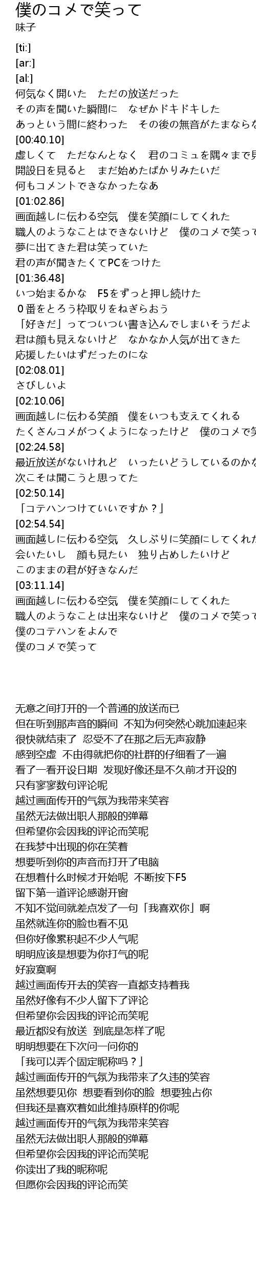 | [02:17.10] | たくさんコメがつくようになったけど 僕のコメで笑って |