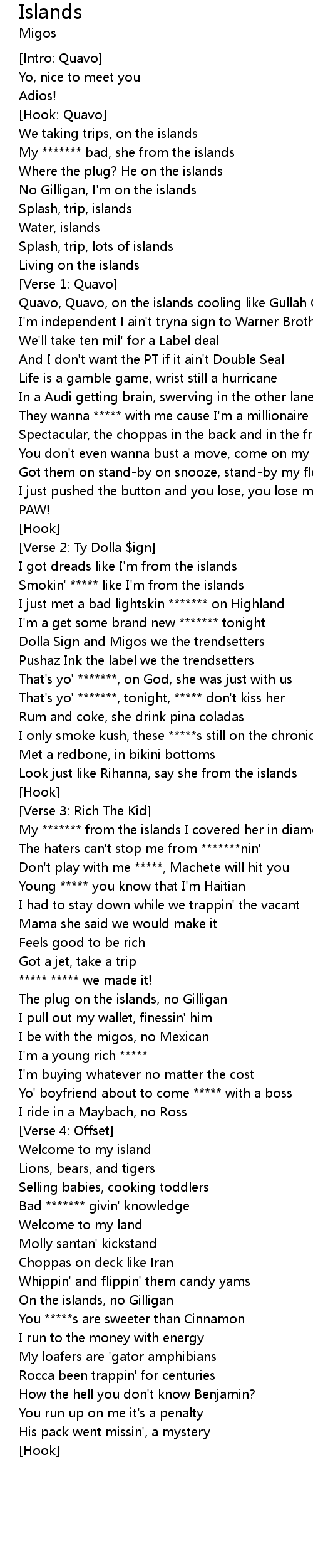 | Quavo, Quavo, on the islands cooling like Gullah Gullah | |