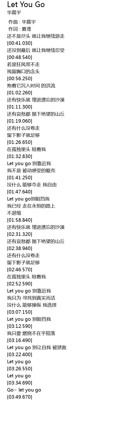 | [01:49.390] | Let you go bié zǔ dǎng wǒ |