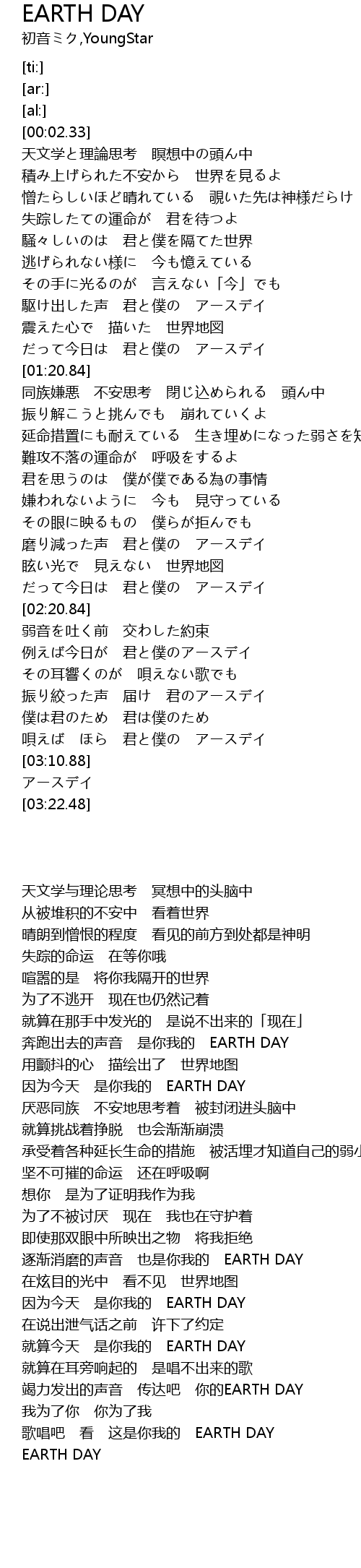 | [02:03.42] | 磨り減った声 君と僕の アースデイ |