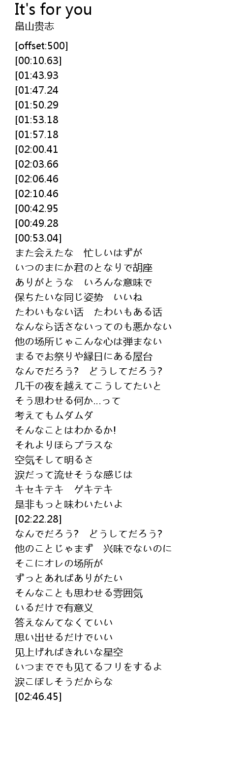 | [02:50.09][01:43.93][00:14.70] | オレらはなんで知り合って |