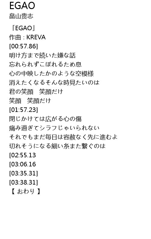 | [03:16.51][02:55.13] | 笑顔 笑顔だけ |