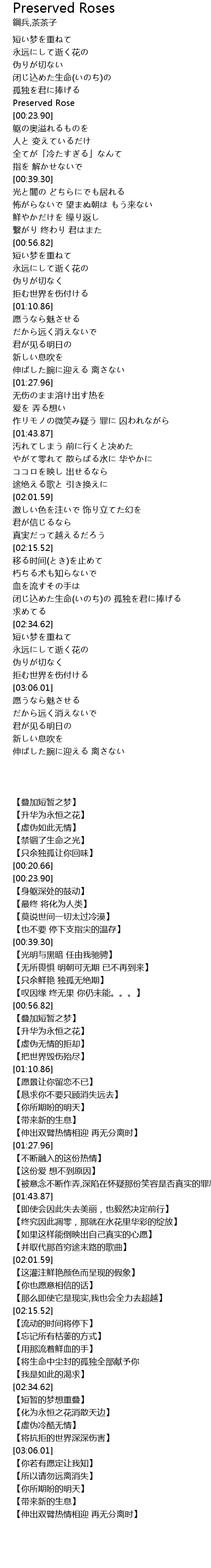 | [02:24.33] | 闭じ込めた生命(いのち)の 孤独を君に捧げる |