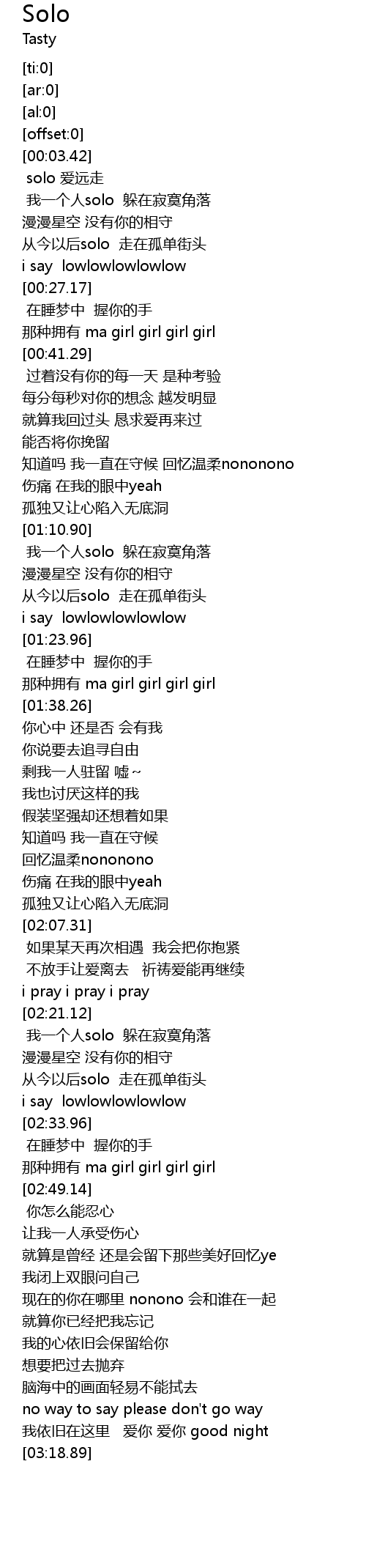 | [01:17.91] | cóng jīn yǐ hòu solo zǒu zài gū dān jiē tóu |