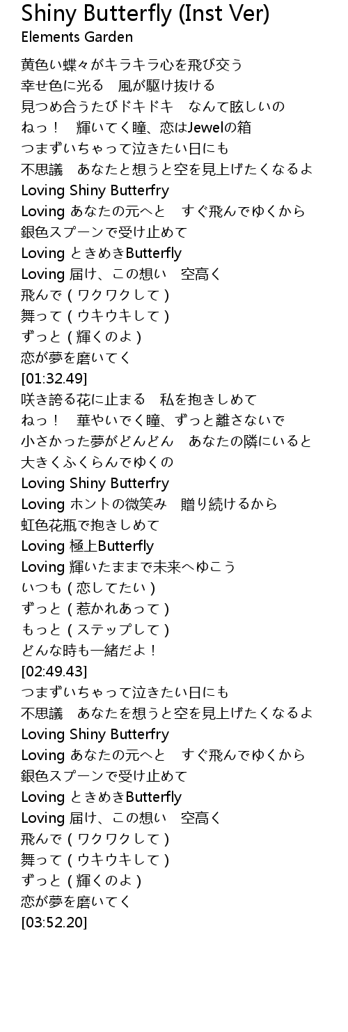 | [00:16.70] | 黄色い蝶々がキラキラ心を飛び交う |