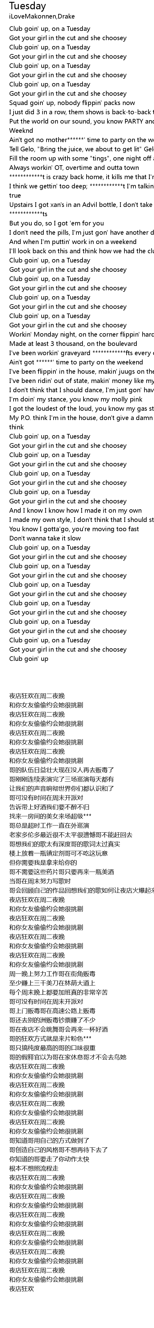 | [04:33.100] | Club goin' up, on a Tuesday |