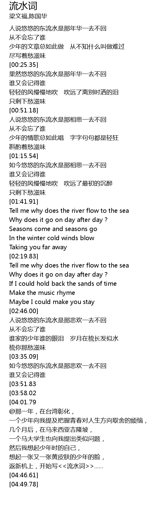 | [01:57.35] | Tell me why does the river flow to the sea |
