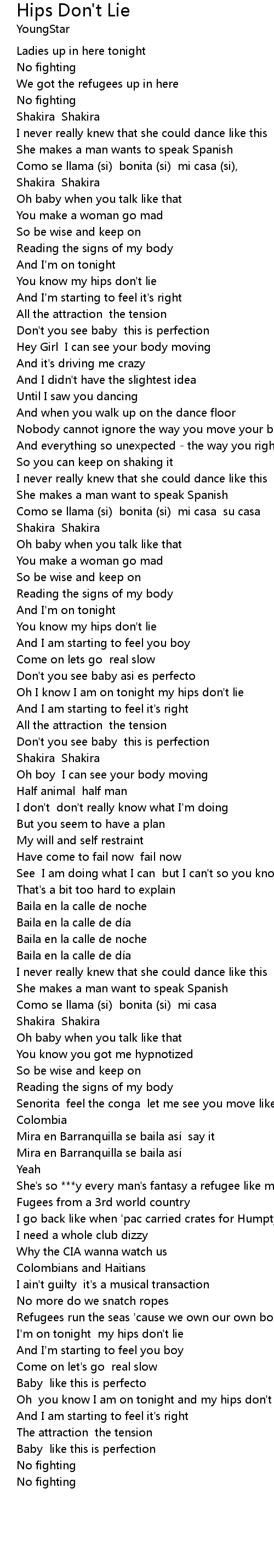 | [03:15.23] | Oh you know I am on tonight and my hips don' t lie |
