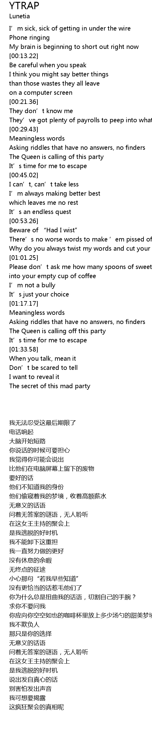 | [00:57.97] | Why do you always twist my words and cut your wrist? |