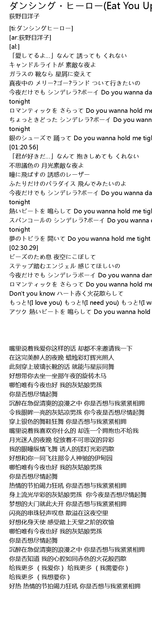 | [01:59.00] | jīn yè ? Do you wanna dance tonight |