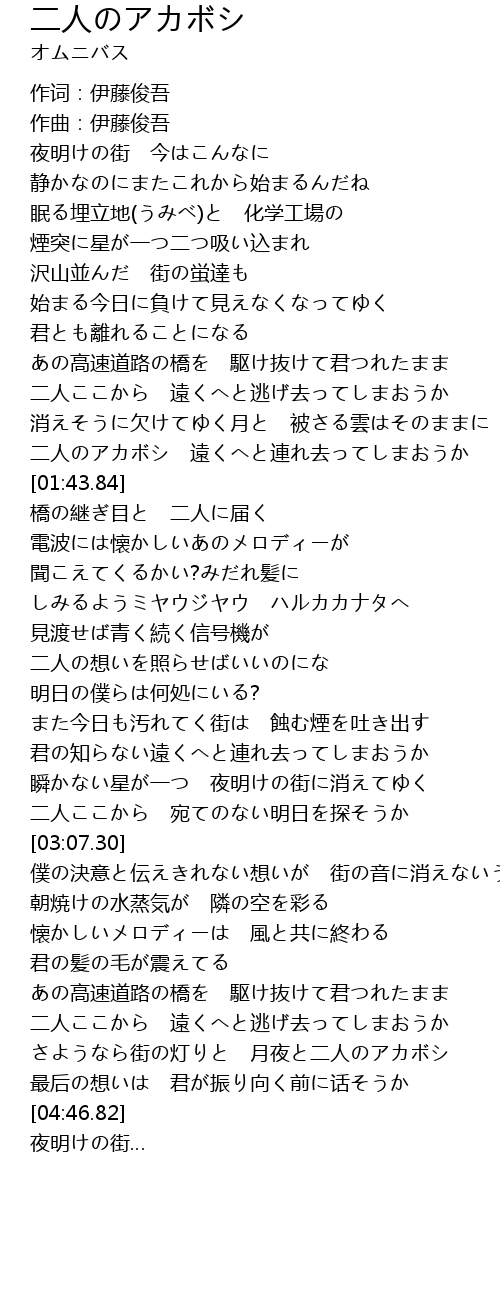 | [02:57.60] | 二人ここから 宛てのない明日を探そうか |