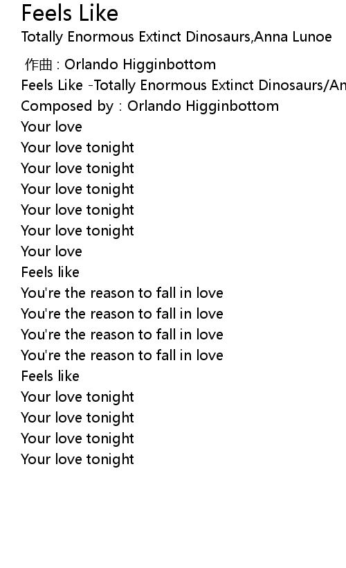 | [00:00.210] | Feels Like -Totally Enormous Extinct Dinosaurs/Anna Lunoe |